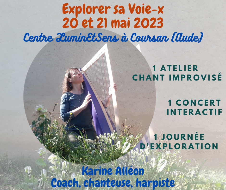 Mêlant chansons, musique d'ambiance, poésie, conte, improvisation vocale et instrumentale, avec ma voix et ma harpe, je vous emmène dans un univers où tous les possibles existent et se manifestent.